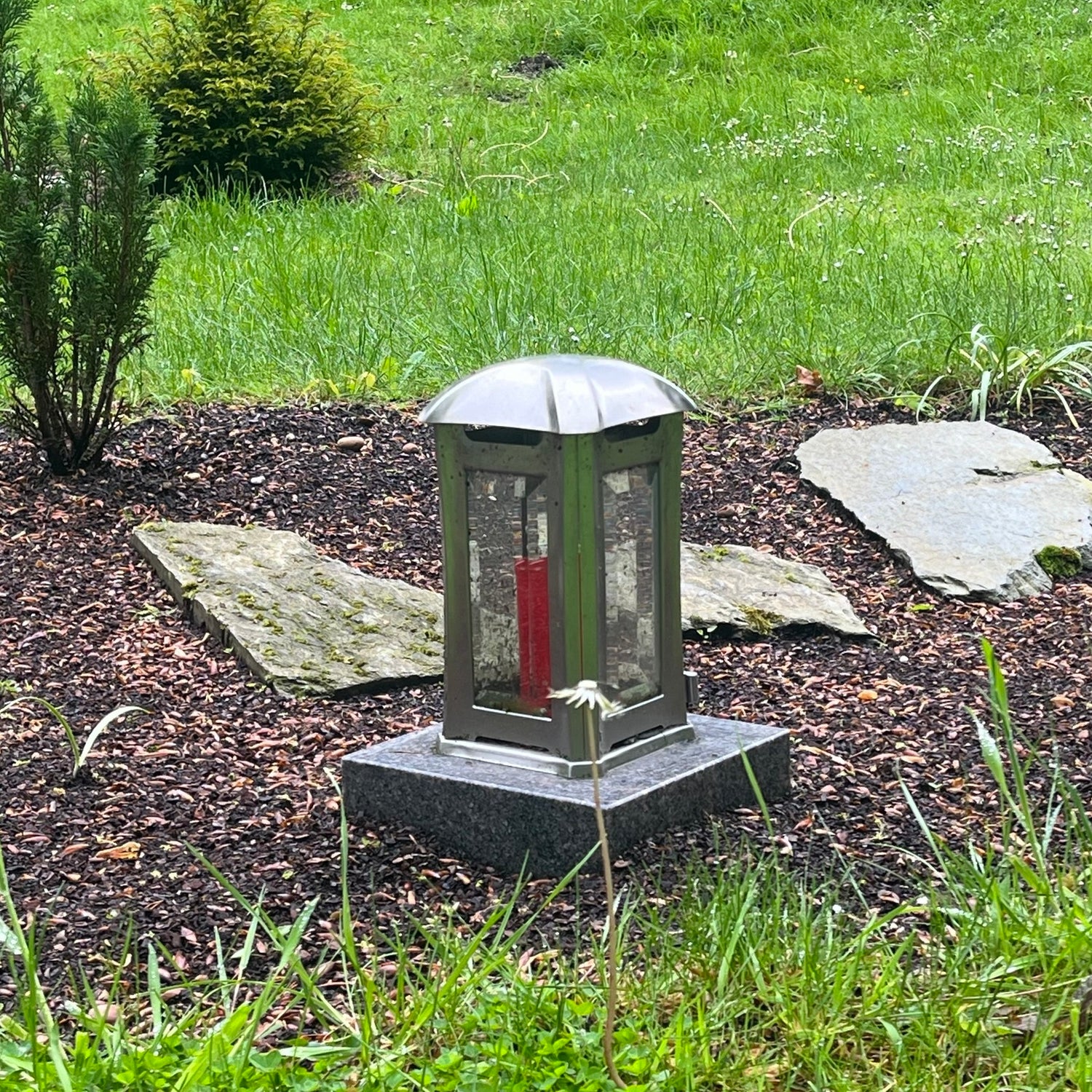Eine Edelstahl-Grablaterne passt harmonisch zu jedem Grab und lässt sich einfach reinigen, was sie ideal für den dauerhaften Einsatz macht.